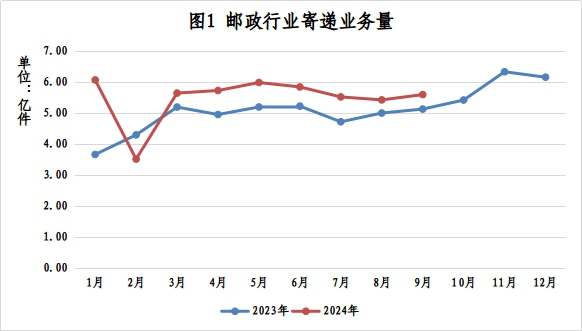 9月份,邮政行业寄递业务量完成5.60亿件,同比增长9.11%。其中,快递业务量完成5.05亿件(注1),同比增长9.82%(按可比口径计算,下同)。