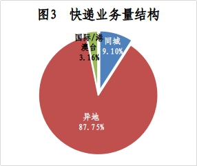1-9月,同城、异地、国际/港澳台快递业务量分别占全部快递业务量的9.10%、87.75%和3.16%。与去年同期相比,同城快递业务量的比重下降0.2个百分点,异地快递业务量的比重下降0.1个百分点,国际/港澳台快递业务量的比重上升0.3个百分点。